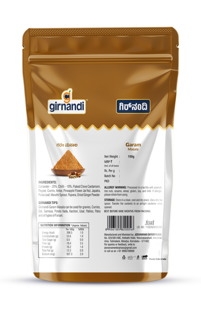 Girnandi Garam Masala 100g Packet is Jeevanram Enterprises’ aromatic homage to Karnataka’s spice trails, fusing Mysore’s timeless recipes with FSSAI-certified (No. 1224322000355) excellence. Hand-sourced from Mandya’s spice gardens and finely ground in small batches, this powerhouse captures the brochure’s warm tones – coriander’s earthiness, black pepper’s bite, cloves’ floral punch, cardamom’s sweetness, cumin’s nuttiness, and cinnamon’s bark balance – for a super blend that’s preservative-free and filler-free. Purity Plus (6+ lab checks) ensures vibrant aroma, robust potency, and brochure-like harmony: Balanced medium warmth, layered florals, and procurement-fresh vibrancy that elevates every gravy.