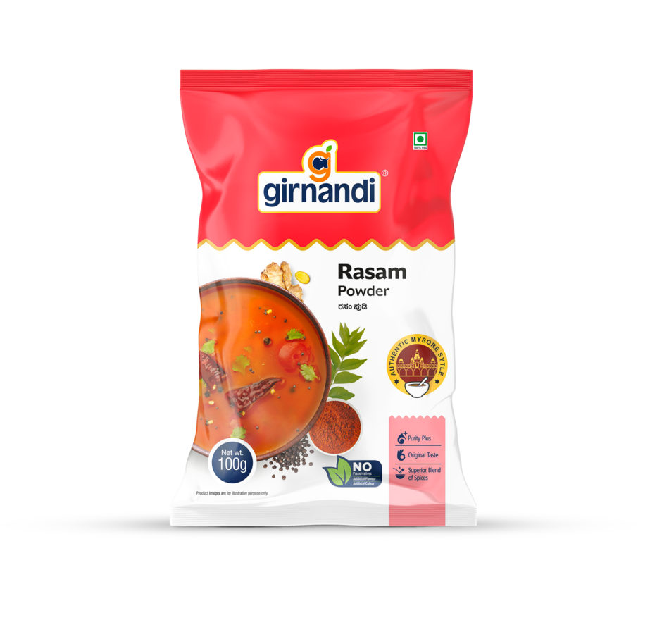 Girnandi Rasam Powder Packet: Mandya’s handcrafted tangy essential, blending tradition with modern innovation – farm-fresh, FSSAI-certified purity in every packet. No preservatives; super blends for vibrant soup magic.