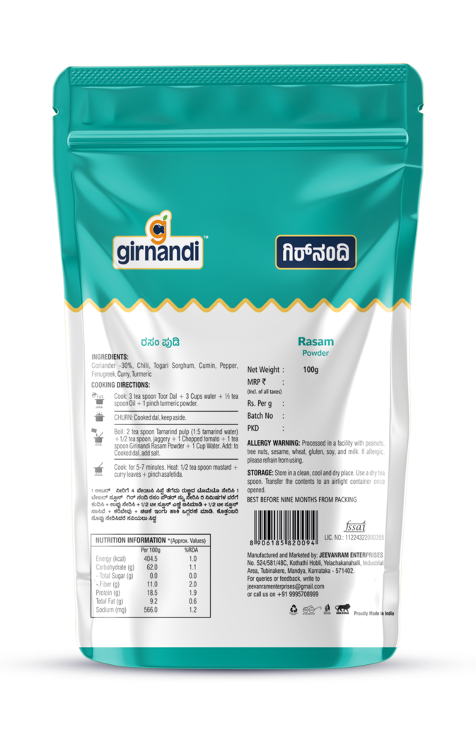 Girnandi Rasam Powder 100g Packet is Jeevanram Enterprises’ soothing homage to Karnataka’s soup rituals, fusing Mysore’s timeless recipes with FSSAI-certified (No. 1224322000355) excellence. Hand-sourced from Mandya’s spice fields and finely ground in small batches, this powerhouse blends coriander (30%), cumin, chilli, pepper, tamarind – for a super blend that’s preservative-free and filler-free. Purity Plus (6+ lab checks) ensures vibrant aroma, robust potency, and brochure-like zing: Balanced sour heat, layered earthiness, and tamarind depth that simmers to one-pot perfection.