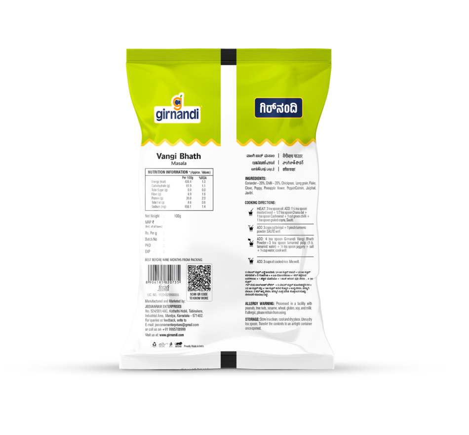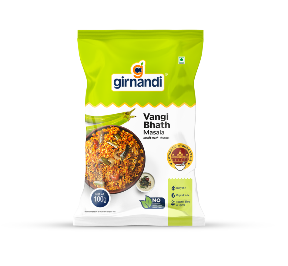 Girnandi Vangi Bath Masala 100g Packet – where Mandya’s brinjals meet your plate. Add to cart and crunch the legacy! +91-99957-08999 for queries.