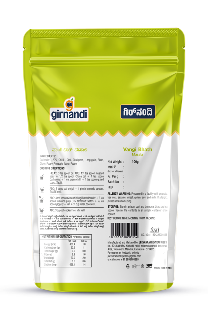 Girnandi Vangi Bath Masala 100g Packet is Jeevanram Enterprises’ festive homage to Karnataka’s brinjal delights, fusing Mysore’s timeless recipes with FSSAI-certified (No. 11432000355) excellence. Hand-sourced from Mandya’s spice fields and finely ground in small batches, this powerhouse mixes coriander (20%), chilli (20%), chickpeas, long grain, flake, clove, poppy, pineapple flower, pepper – for a super blend that’s preservative-free and filler-free. Purity Plus (6+ lab checks) ensures vibrant aroma, robust potency, and fresh harmony: Balanced medium heat, layered earthiness, and chickpea depth that simmers to one-pot perfection.